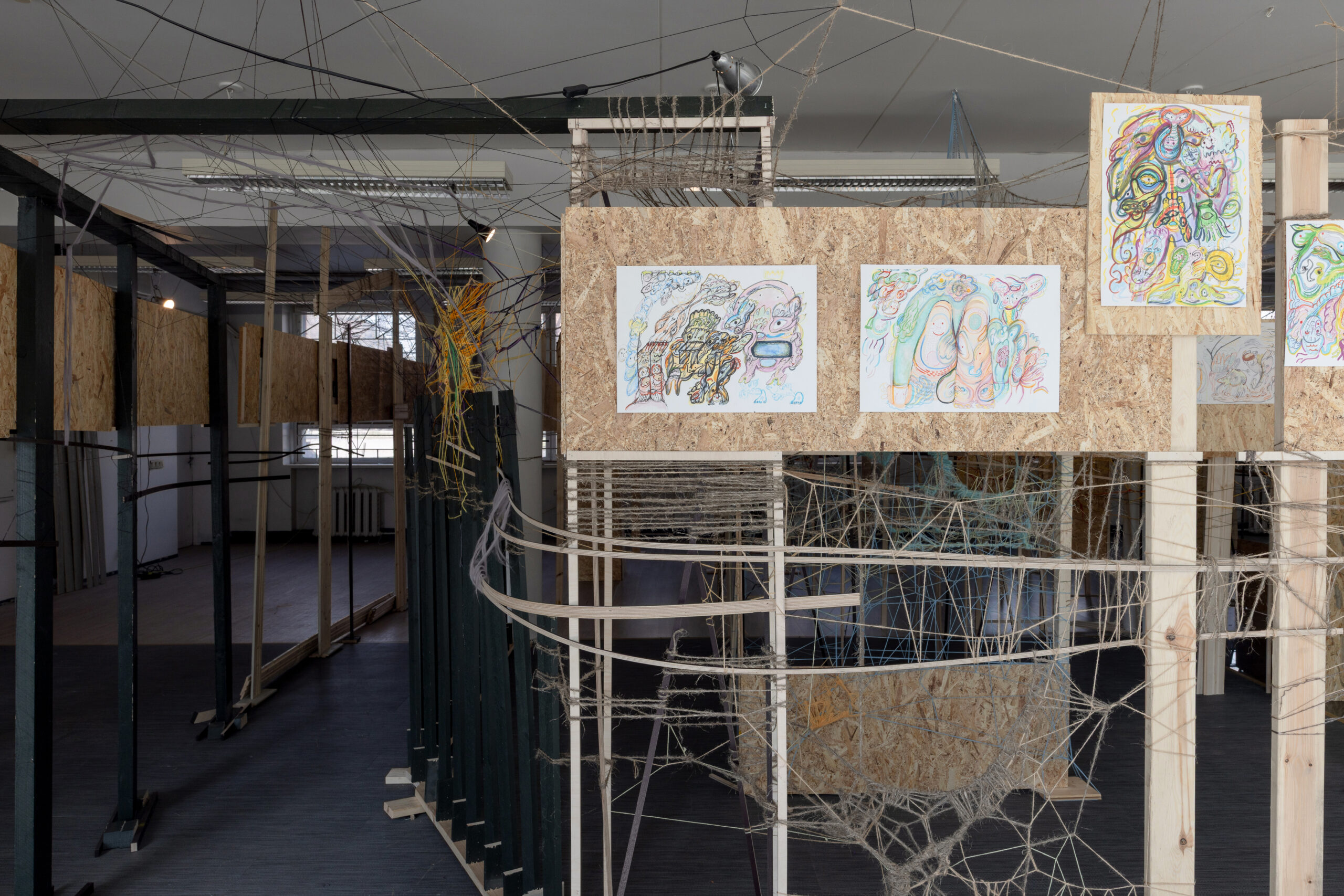 The project was a systematic facing, mapping and healing of shadows over 10 month period. Through automatic drawing, I entered memories connected to fear, shame, guilt, and grief, experiencing the transformation of pain into freedom through 144 drawings. The drawings were installed inside a Fibonacci sequence corridor I built from leftover wood. Arranged as a linear path I built the inner spiral of healing into a timeline that could be walked step by step. Alongside the drawings, colorful weawing was made as a symbol of new growth, life emerging from the fertile ground of darkness and suffering. The act of weaving marked the beginning of regeneration, an updated living fabric of life slowly forming where pain had once been concentrated. The installation took place in a former sporting goods store called “Dynamo.” Dynamo, in its essence, is a mechanism that transforms motion into light, a reminder that inner movement creates its own power.